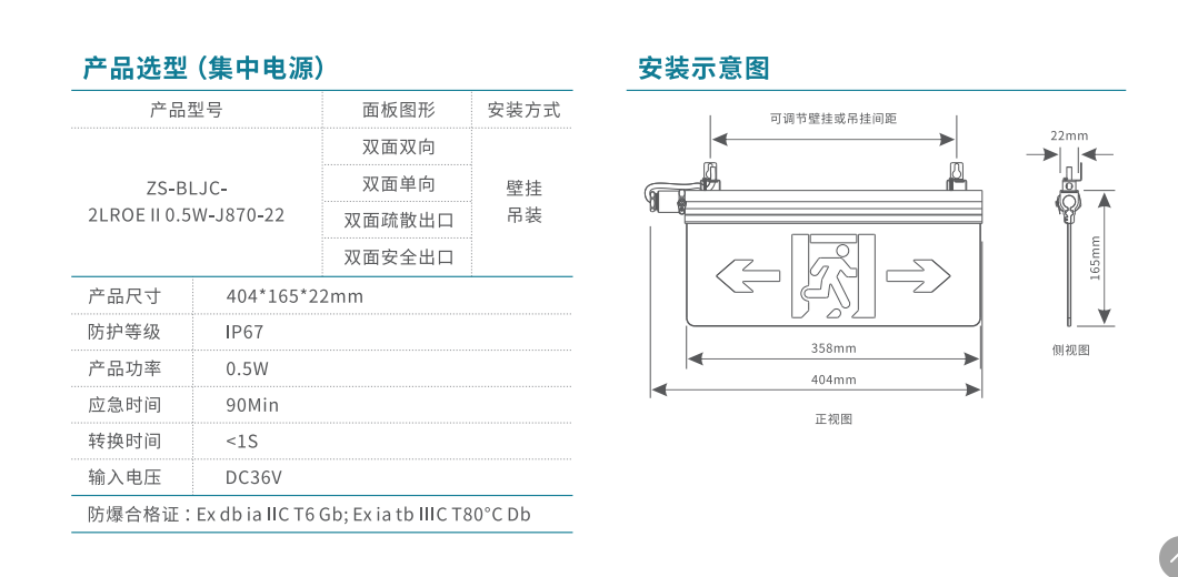 本安型防爆-安全出口消防應急標志燈 | ZS-BLJC-2LROEⅡ0.5W-J870-22 | 壁掛/吊掛